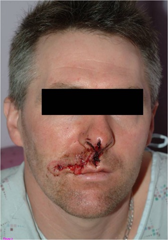 Case 2 occurred when a right-handed, 40 year old male was injured when the angle grinder he was using kicked back from the edge of a wooden plank.  He sustained an open soft tissue wound involving the right upper lip, philtrum and nasal tip, fig3.