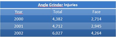 Injuries resulting from the use of angle grinders are numerous. The most common sites injured are the head and face. The Royal Society for the Prevention of Accidents (RoSPA) Home and Leisure Accident Surveillance Systems (HASS/LASS) data collected from 2000 to 2002 showed that angle grinders were third in their top ten list of most dangerous tools, with an average of 5,400 injuries recorded yearly [1]. The increasing number of recorded angle grinder injuries during three consecutive years (2000 to 2002) reported in the HASS/LASS data is alarming. The vast majority of facial injuries are associated with foreign body penetration following shattering of the abrasive wheel. Open facial wounds are much less common, but can be very disfiguring.