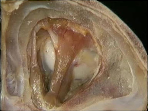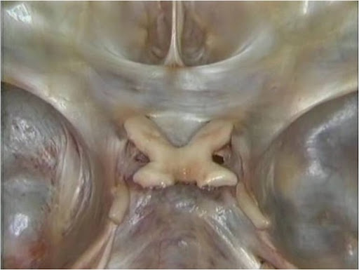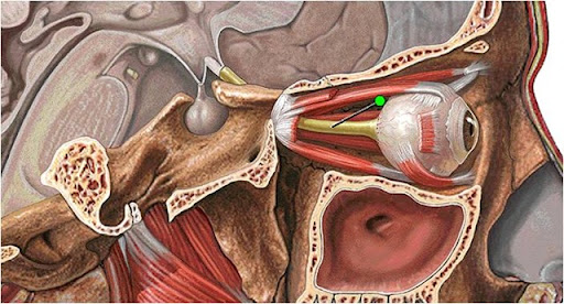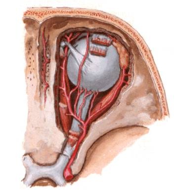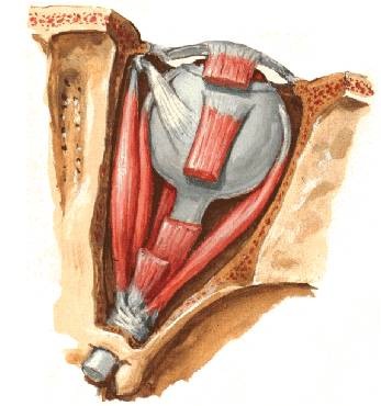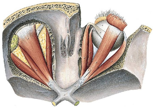 ( Imagem superior, removido o teto da órbita. Na imagem esquematiza visualizamos os músculos extrínsecos do olho e o canal óptico. Abaixo veremos uma sequência de dissecação das estruturas anatômicas)
