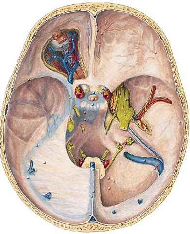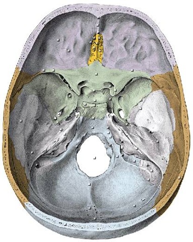 Imagens demonstrando a posição do nervo óptico (em amarelo) que atravessa o canal óptico para entrar na órbita.