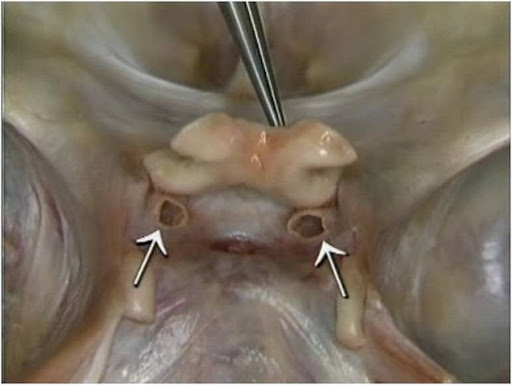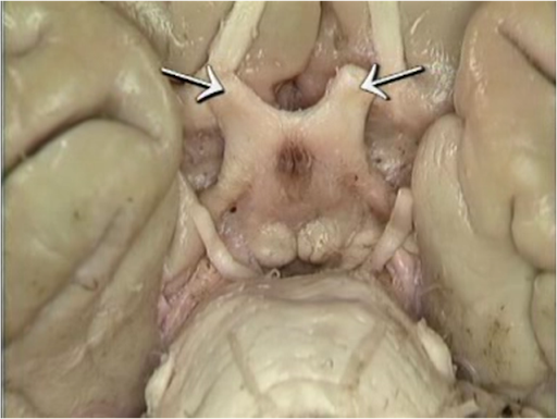 (setas mostrando a artéria carótida interna, abaixo do quiasma óptico).