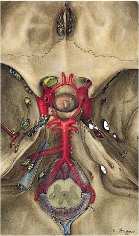 (setas mostrando a artéria carótida interna, abaixo do quiasma óptico).