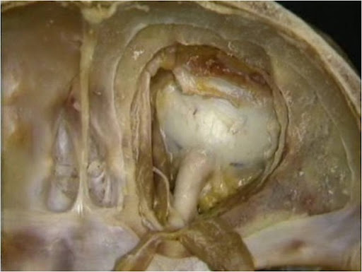 ( Imagem superior, removido o teto da órbita. Na imagem esquematiza visualizamos os músculos extrínsecos do olho e o canal óptico. Abaixo veremos uma sequência de dissecação das estruturas anatômicas)